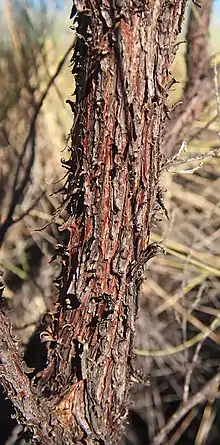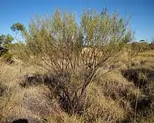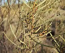 The spreading shrub or tree has minni ritchi style bark typically grows to a height of 1 to 4 metres (3 to 13 ft) but can reach as high as 6 m (20 ft).[3] The crown is often spreading but sometimes flat-topped. The bark is a burgundy red to reddish-brown colour which peels off the trunk and branches in thin strips that curl backward. The narrowly linear shaped phyllodes have a length of 4 to 10 cm (1.6 to 3.9 in) and a width of 0.8 to 2 mm (0.031 to 0.079 in) in the typical variant which become longer and wider for the dwarf variant. The dull green phyllodes are normally soft and delicate and can be straight or shallowly curved or wavy. They have three or more parallel longitudinal nerves per face but normally only the central nerve is apparent. The apex narrows to a fine and pungent point.[1] It blooms from April to October producing yellow flowers.[3] The simple inflorescences simple form as a flower-spike that is 9 to 30 cm (3.5 to 11.8 in) in length. The seed pods that form later have a narrowly oblong to linear shape. the pods are flat with straight sides with little constriction between seeds. The resinous, sticky, shiny brown pods have a length of 7 to 11 cm (2.8 to 4.3 in) and a width of 7 to 12 mm (0.28 to 0.47 in) and are strongly an commonly irregularly curved. The seeds within are arranged obliquely and have a spherical to obloid shape. The shiny dark brown to black seeds are 5 to 8 mm (0.20 to 0.31 in) in length and 4 to 7 mm (0.16 to 0.28 in) wide with a dull yellow to brown depression at the centre.[1]