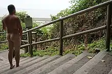The earliest evidence of Indigenous peoples inhabitation dates back to 13,000 B.C. being the hunting, fishing, logging, spiritual connection grounds for the Musqueam, referred to as “Ulksen” or “the nose”.[1] The beach is man-made, reclaimed from the sea in a joint venture with the Canadian Army and UBC to train cadets for beach landings in WWI, hence the presence of the "instrument towers". In the Great Depression, nude bathing became popular due to high costs of swimsuits with men congregating on Siwash Rock in Stanley Park, in order to escape the puritanicalist oppression of local residents, a legacy of the Victorian era, they then flocked to Wreck. The beach increased in popularity with hippies until the late 1960s when a police raid in 1970 yielded a dozen arrests. The Georgia Straight staged a nude-in protest with 3,000 showing up and the charges were dropped, with the police designating the area as a "no-harm, no-foul zone" until 1991 when it was officially designated a legally recognised nudist beach.[2] On January 25, 1977, the Citizens Concerned for Coward's Cove was formally established, then changed to Wreck Beach Committee, then to the Wreck Beach Preservation Society in 1983. The WBPS has fought against these developments; a 20-million cubic meter dredging operation behind the North Arm breakwater; a parallel trail from Trail 6 to Trail 7 (One already built there quietly by two unknowns); a proposal to barge millions of gallons of "jet-fuel A" past Wreck Beach weekly; toe-to-cliff-top condominiums (proposed in 2004);[3] a 20-foot high, 10-foot wide sea wall over the beach it would supposedly have been meant to protect; viewing platforms which would have changed the interpretation of the Canadian Criminal Code insofar as nudity was concerned; the cutting of 40-acres of cliff face forest and then, the shaving of the cliffs in those 40-acres, and the construction of an RCMP service road to and along the beach. Current threats to the beach area include a restaurant overlooking the beach, the elimination of all curb-side parking, the grassing in of Marine Drive, and possible washrooms on the beach level instead of above and out of sight of the beach.[4] In 2012, permanent toilet outhouses were installed.[5]