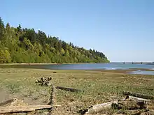 Wreck Beach (Squamish: Ts'at'lhm) is a clothing-optional beach located in Pacific Spirit Regional Park, which is in turn part of the University Endowment Lands just west of Vancouver, British Columbia, Canada. The clothing-optional section is clearly marked with signs and stretches approximately 6.7 kilometres or 4.2 miles from Acadia Beach, in the north, to the Booming Grounds Creek on the north arm of the Fraser River. The park is administered by the Greater Vancouver Regional District (GVRD), though Indigenous claims are repeatedly asserted, especially by the Musqueam Nation.