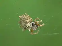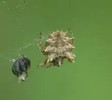 The abdomen of the starbellied orbweaver is covered with several spikes that have inspired its name. Like other orb weaver spiders, it is nocturnal and creates vertical webs to catch flying insects.[5]