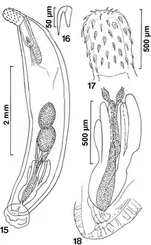 | Acanthocephalus parallelcementglandatus from Clarias batrachus. 15) Holotype male. Note the piercing of the incomplete outer proboscis receptacle posteriorly with retractor muscles. 16) A typical hook near the middle of the proboscis 17. Proboscis 18) Posterior part of the reproductive system showing detail of the parallel cement glands, common cement ducts, and sperm duct system (dotted). | |