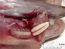 | Female A. limandae attached to Limanda limanda. The two white cylindrical objects are its egg sacs. | |