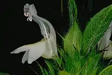 The inflorescence includes bracts armed with centimeter-long spines and glandular, hairy white to pink-tinted flowers up to 2.5 centimeters long. Each flower has lobed, hooded upper and lower lips forming a deep cup.