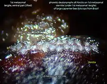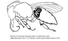 • Various forms of acarinaria have evolved within different lineages of carpenter bees, in the Old World subgenera Koptortosoma and Mesotrichia - in some cases, the entire anterior portion of the metasoma is hollowed out into an enormous internal chamber, entered through a small opening on the face of the first metasomal tergite, in which the mites can travel. Some species in these groups also have supplementary acarinaria on the mesosoma in addition to the metasomal chamber.