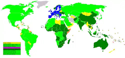 Some delegations are responsible for European Union activities and relations with third countries that have not established diplomatic relations with the EU and for special territories of EU member states, including some that are part of the EU itself (OMR). Territories that host office subordinate to such delegation are marked with *.