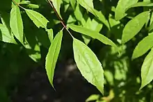 The leaves have a 7–10 cm (3–4 in) petiole and three leaflets; the leaflets are short-stalked, oblong, 5–10 cm (2–4 in) long and 1.5–3 cm (0.5–1 in) broad, with serrated margins, the central leaflet the same size as or slightly larger than the two side leaflets. It leafs out early in the spring and the deep green leaves are contrast with its red petioles throughout the growing season.[2]
