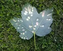 Underside of sycamore leaf with 'felt' gall patches