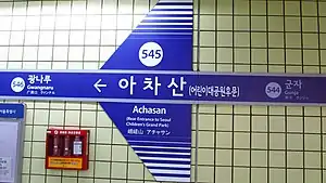 Achasan (Korean: 아차산; Hanja: 峨嵯山), also known as Rear Entrance to Seoul Children's Grand Park, is a subway station on Line 5 of the Seoul Metropolitan Subway. Located in Gwangjin-gu, in Seoul, South Korea the station is near the rear entrance of Seoul Children's Grand Park.[1][2][3]