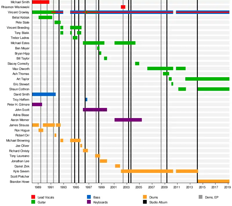 - Vincent Crowley – Guitars (1988–1991, 1996–1998, 2008), Vocals (1991–1994, 1994–2010, 2010–2019), Bass (1991–1994, 1994–2010, 2010–2019)