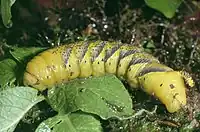 There are several generations of Acherontia atropos per year, with continuous broods in Africa. In the northern parts of its range the species overwinters in the pupal stage. Eggs are laid singly under old leaves of Solanaceae: potato especially, but also Physalis and other nightshades. However it also has been recorded on members of the Verbenaceae, e.g. Lantana, and on members of the families Cannabaceae, Oleaceae,[11] Pedaliaceae and others. The larvae are stout with a posterior horn, as is typical of larvae of the Sphingidae. Most sphingid larvae however, have fairly smooth posterior horns, possibly with a simple curve, either upward or downward. In contrast, Acherontia species and certain relatives bear a posterior horn embossed with round projections about the thicker part. The horn itself bends downwards near the base, but curls upwards towards the tip.