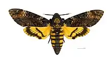Death's-head hawk moths are large, ranging from 3.5 to 5 inches (80–120 mm) as adults.[1] The upper wings are dark, creating a stark contrast between them and the lower wings, which range from a bright yellow to a light cream, yellow being the more common.