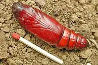 The caterpillar of the African death's-head hawkmoth is also sturdy and somewhat variable in colour, being some shade of buff, green or brown, with seven diagonal blue lines. At the rear is a curved, thorn-like horn. It can attain a length of 5 to 6 in (13 to 15 cm). The other two species of death's-head hawkmoth similarly have three larval color forms: typically, green, brown and yellow. The pupa is stout and reddish-brown, and is formed 8 to 10 in (20 to 25 cm) under the ground in a chamber the size of a large hen's egg.[3]