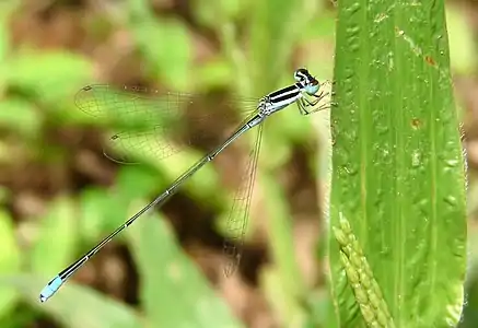 It is a long slender damselfly with a black spot in blue on the 8th segment of the abdomen. Its thorax is black with lateral azure blue stripes. Its abdomen is extremely slender with black on dorsum of segments 1 to 7 and light blue on the lateral sides. Segment 8 is blue with a narrow triangle black dorsal spot, segment 9 is blue. Segment 10 is black on dorsum and blue on the sides. Female is similar to the male except in the last three abdominal segments. Segment 8 has a broad black mark on dorsum, 9 with a small basal dorsal spot, and 10 is entirely blue.[6][7][8][3][4]