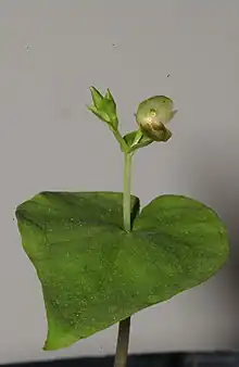 This species is distinguished from others in the genus by its relatively large leaf, large floral bracts and greenish and brown flowers[2]