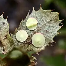 Acraspis guadaloupensis (also Paracraspis guadaloupensis) is a relatively uncommon species of cynipid wasp that produces galls on intermediate oaks.[1] The intermediate oak disc wasp was first described in 1911 and has been moved between genera more than once.[2] Distribution is limited to California in North America.[3] The flattened galls appear on leaves of Quercus chrysolepis, the canyon live oak (or maul oak).[4]