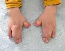 Acrocephalosyndactyly is a group of congenital conditions characterized by irregular features of the face and skull (craniosynostosis) and hands and feet (syndactyly).[1] Craniosynostosis occurs when the cranial sutures, the fibrous tissue connecting the skull bones, fuse the cranial bones early in development. Cranial sutures allow the skull bones to continue growing until they fuse at age 24. Premature fusing of the cranial sutures can result in alterations to the skull shape and interfere with brain growth.[2][3] Syndactyly occurs when digits of the hands or feet are fused together.[4] When polydactyly is also present, the classification is acrocephalopolysyndactyly.[5] Polydactyly occurs when the hands or feet possess additional digits.[6] Acrocephalosyndactyly is usually diagnosed after birth, although prenatal diagnosis is sometimes possible if the genetic variation is present in family members, as the conditions are typically inherited in an autosomal dominant pattern[1] Treatment often involves surgery in early childhood to correct for craniosynostosis[7] and syndactyly.[8]