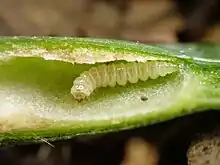 Acrocercops leucocyma larva feeding on a kauri leaf