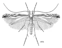 ♀︎. 9mm. Head and palpi white. Antennae fuscous, beneath white. Thorax light grey. Abdomen whitish. Legs dark grey, ringed with white, posterior tibiae white. Fore-wings elongate, very narrow, pointed ; grey ; markings snow-white ; a rather broad irregular streak along inner margin from base to apex, interrupted before middle by a very oblique indistinct line of ground-colour ; eight short more or less wedge-shaped streaks from costa, first from 14, slenderly produced on costa towards base, first four outwardly oblique, remainder inwardly oblique, second and fourth reaching half across wing, the rest much shorter ; a small irregular blackish apical dot, preceded by a white dot : cilia ochreous-grey-whitish, round apex whiter, with indications of two dark fuscous lines. Hindwings whitish-grey ; cilia ochreous-grey-whitish.[2]