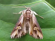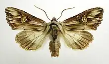 A. polyodon Cl. (= perspicillaris L.) (15 d). Forewing bone-colour suffused with olive brown along costa and inner margin and interrupted along termen; the reniform stigma also placed on an olive brown cloud: costa and space between veins 2 and 4 tinged with purplish pink; a black streak from base in submedian fold and a double one from inner margin near base; reniform stigma large, pale olive with linear centre and outline creamy white; veins towards margin dark, forming centre of wedgeshaped marks, 3, 4 and 7, 8 broadly edged with ground colour and cutting the dark fringe; outer line marked by dark dots on veins: hindwing bone-colour with broad brownish margin and blackish veins. - Larva red-brown, dotted with black; a subdorsal row of oblique brown marks; dorsal and spiracular lines yellow; head brown. [1] The wingspan is 31–36 mm.