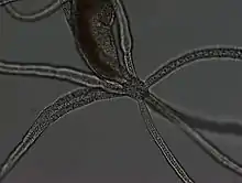 Actinulida are an order of hydrozoans in the subclass Trachylinae. Very small, medusoid Hydrozoa without polyp phase, living in the sand interstitial, solitary, bell entirely or very much reduced, epidermis ciliated, 1-2 whorls of tentacles, statocysts present or not, club shaped and derived of ecto- and entodermal tissue; cnidome may include stenoteles.[1]