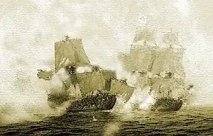 The pursuit took place over two days, with the Castillo Nuevo, itself a captured Spanish ship of the line, managing to split course from the Danzik and evade their Spanish pursuers. Fitz-James Stuart ordered his ships to disregard the Castillo Nuevo and continue their pursuit of the Danzik. Chirif was successfully able to avoid taking cannon fire from the Spanish by sailing windward, which prevented the Spanish ships from opening the ports of their gundecks.[6] Despite this, the Spanish ships were able to fire their bowsprit cannons at the Danzik, which suffered damage to her rigging and sails, forcing her to slow down until the Spanish ships were close enough to board.[1] For a brief moment, she struck her colours, but Chirif, urged on by his crew, ordered it to be hoisted again and resumed the action until the sunset, when both himself and Stuart declined to continue fighting due to rough sea.[1] The next day the Spanish warships attacked again, and in the ensuing conflict a duel emerged between the Dragón and the Danzik. This inflicted heavy casualties upon the Danzik and caused significant damage to the ship. Finally, seeing no other option, Chirif lowered his colours again and surrendered for the second and last time. Fitz-James Stuart sent men on board the ship to take possession of it. The losses on the Spanish side was negligible, amounting to be only 3 killed and 25 wounded, compared to 194 killed and about 90 wounded on the Algerine ship. The Danzik, severely damaged, had to be set on fire after 320 prisoners-of-war were transferred aboard Stuart's flagship, among them Chirif, wounded during the battle, and 50 rescued Christian slaves, who were mostly Dutch sailors.[4]