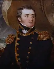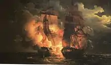 The frigates closed in to pistol range without opening fire.[20] As they passed each other, Aréthuse came about and fired her broadside at Amelia that cut the braces of her topsail; Amelia answered in kind, and then veered and abruptly decreased her speed, her davit touching Aréthuse at starboard.[13] Aréthuse fired another broadside at point-blank range, and for the following hour and a half, the two frigates remained entangled, exchanging volleys,[13] gunners from both sides snatching the ramrods of their opponents and duelling with sabres from one gunport and the other,[20] but neither side attempting to board the other.[13] After 90 minutes of cannonade and gunfire, Captain Irby and his two lieutenants, John James Bates and John Pope,[21] were wounded. The third lieutenant, George Wells,[21] was killed soon after taking command, and the master of Amelia, Anthony De Mayne,[21] replaced him.[13] Then, Bouvet attempted a boarding to decide the issue, but with her clewlines cut by shots,[13] Aréthuse could not maneuver.[20] At 21:00, the frigates separated.[2] The cannonade continued until 23:00, when the frigates lost contact.[2] Soon, a dense fog hid the frigates one from another, and it was not until the next morning that Amelia was spotted again. According to Bouvet's report, Aréthuse attempted to give chase, but to no avail.[2][13]