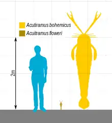 Acutiramus is classified as part of the eurypterid family Pterygotidae, a family differentiated from other eurypterids by their flattened telsons (the most posterior segment of the body) and their modified chelicerae (frontal appendages), ending in well-developed chelae (claws). Many pterygotid eurypterids, such as Jaekelopterus and Pterygotus, grew to gigantic proportions. Acutiramus was no exception, with the largest species, A. bohemicus, surpassing 2 metres (6.6 feet) in length.[5] All species were not this large though, with some (such as A. floweri) only reaching lengths of 20 centimetres (7.9 in).