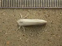 The wingspan is about 30 mm. Adult females are white and have an orange tuft on the tail. Males are also white but sometimes have a dark mark at the tornus of each forewing or a broad dark band along the margin of each forewing. The hairs around the thorax are sometimes yellowish. Sometimes the black skin of the thorax and/or abdomen shows through between the white hairs.