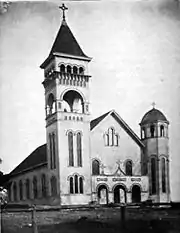 Finally in April, 1879 the village of Adair was platted by Mr. Thomas Dockery at the behest of Mr. Cody and his wife Mary.[4] It was named after its county.[5] By the 1880s Adair's list of business and manufacturing enterprises included a druggist/physician, saw mill, flour mill, hotel, millinery, shoe maker, wagon maker, hoop factory, general store, a livery, and stock dealer.[3] Adair continued to see growth through the remainder of the late 19th and early 20th century, with a population estimated at over 400 by 1905 when the new St. Mary's Catholic Church was completed. One blemish, inexplicable considering the village's growth, was the closing of the Adair Post Office on October 31, 1905.[2] The years after World War I and the Great Depression witnessed large migrations from rural farming to urban industrial areas across America—especially among young adults—and this caused a rapid decline in Adair's population and business offerings.[3] Additionally, much-improved roads meant easier travel to area towns and cities like Baring and Kirksville for supplies. The possibility of an oil boom caused some excitement around Adair, and the region as a whole, in the 1940s. Oil wildcatters drilled a test well near Adair and oil was struck. However it was determined to not be of sufficient quality or quantity to interest major oil companies in further development.[2]