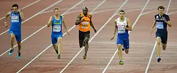 On 31 May 2015, he broke the 10-second barrier in the 100 m for the first time in his career, with a run of 9.97 seconds; however, the wind speed (+3.7 m/s) was above the legal wind limit.[20] Two months later, on 7 July at the Diamond League meeting in Birmingham, he became the 100th man in history to break the 10-second barrier legally, again clocking 9.97 seconds (+2.0 m/s); however, he fell as he crossed the line, picking up a hamstring injury which would cause him to miss the 2015 World Championships.[21][4][22]
