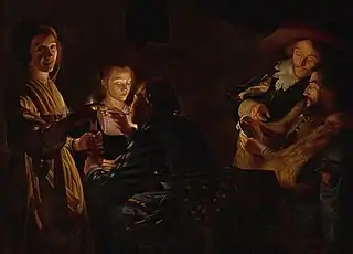Adam de Coster[1] (c. 1586 in Mechelen – 4 May 1643 in Antwerp) was a Flemish painter. He was a prominent member of the Antwerp Caravaggisti. These Caravaggisti were part of an international movement of European artists who interpreted the work of Caravaggio and the followers of Caravaggio in a personal manner.[2] He is mainly known for his genre scenes with strong chiaroscuro effects. He was called a Pictor Noctium (English: 'Painter of Nights') because of his preference for tenebrist scenes.[3]