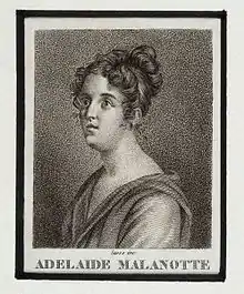 Adelaide Malanotte (1785 – 31 December 1832) was an Italian operatic contralto who performed in major opera houses in Italy from 1806 to 1821. She is best known for creating the title role in the world premiere of Gioachino Rossini's Tancredi in 1813. After her marriage, she performed under the name Adelaide Montresor. Her son, Giovanni Battista Montresor, had a career as a tenor and impresario in the United States.[1] From 1812 until her death 20 years later she carried on an extra-marital affair with the poet Luigi Lechi.[2]