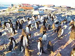 Colony of Adelie Penguin near the French Dumont d'Urville Station on Adélie Land, Antarctica.