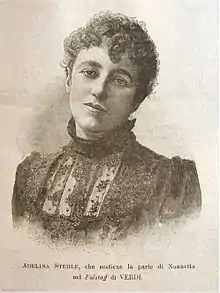 Adelina Stehle (born Graz, 30 June 1860 – died Milan, 24 December 1945) was an Austrian Empire-born operatic soprano, associated almost entirely with the Italian repertory. She studied singing in Milan and debuted as Amina in 1881 in Broni in Lombardy. Her career eventually brought her to La Scala in 1890 where she flourished. She took part in a series of important premieres in the 1890s. In 1893 she was the first Nannetta in Verdi's Falstaff to the Fenton of her husband, Edoardo Garbin, and they were later important in the popularization of Puccini's La bohème.