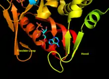 Catalytic site of APRTase with reactants adenine and PRPP resolved. The Hood is believed to be important for purine specificity, while the flexible loop is thought to contain the molecules within the active site.