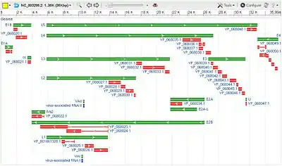 Adenovirus genomes are linear, non-segmented double-stranded (ds) DNA molecules that are typically 26-46 Kbp long, containing 23-46 protein-coding genes.[1] The example used for the following description is Human adenovirus E, a mastadenovirus with a 36 Kbp genome containing 38 protein-coding genes.[2] While the precise number and identity of genes varies among adenoviruses, the basic principles of genome organization and the functions of most of the genes described in this article are shared among all adenoviruses.