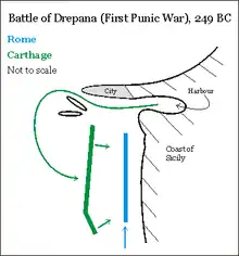 Encouraged by previous victories, the new consul for 250 Gaius Atilius Regulus launched a campaign to attack the last Punic strongholds on the island of Sicily: Lilybaeum and Drepana.[5] For this surprise attack, which was carried out in 249, the Romans mustered a fleet of 123 quinqueremes.[6] Adherbal was tasked to defend Drepana with the assistance of Hannibal the Rhodian and Carthalo.[7][5] In their desire for stealth, the Romans attacked at night causing them to lose their formation.[8] Adherbal commanded the Punic fleet and immediately ordered his forces to set to sea when the straggling line of Roman galleys approached the shore by dawn.[8] His defense cost the Romans 93 ships while Carthage lost nothing.[6]