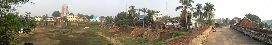 Thiruvadanai is one of the many temple towns in the state which is named after the grooves, clusters or forests dominated by a particular variety of a tree or shrub and the same variety of tree or shrub sheltering the presiding deity. The region is believed to have been covered with Vilva forest and hence called Vilvavanam.[1] Legend has it that Vaaruni, the son of Varuna, the God of rain who was cursed by a Sage to have an elephant's body and a goat's head, regained his normal form after worshiping Shiva at this temple. The name of the town is believed to have been derived from this mythological incident(Thiru- sacred; Adu- goat; Aanai- elephant; Thiru Adanai- the sacred place, where the goat-headed-elephant regained his original form).[2]