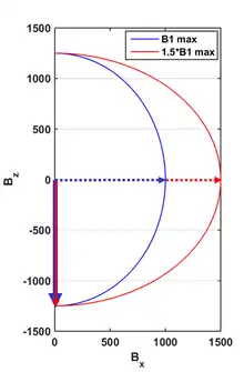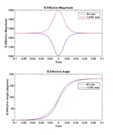It is common to examine the so-called “sweep-diagram” for adiabatic pulses. Sweep-diagrams plot the trajectory of the effective field for a spin with a particular resonance frequency. Figure 3 shows the sweep diagram for two on-resonance spins: blue sweep trajectory for a spin experiencing a B1 field strength without error, and red sweep trajectory for a spin experiencing a B1 field strength with significant deviation. Since the direction of Beffective is largely independent of B1 strength, adiabatic pulses are considered insensitive to B1 inhomogeneities.