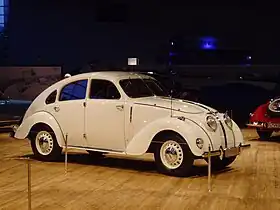 Welded to the frame was a four-door fast back steel body for which the drag coefficient quoted was a remarkable 0.36. The standard body came with four doors, all hinged on the B-pillar, and a huge steel sun roof panel which extended almost to the full width of the roof, and from just behind the front windscreen to half way over the rear doors. In 1939 the size of the removable roof panel was reduced in order to make it more manageable.[3] At the front two headlights were placed close together either side of the grill, but these proved inadequate, and in 1938 a second pair of “wide beam” lights was set into the wings, although from 1938 the regulations permitted only one of these.