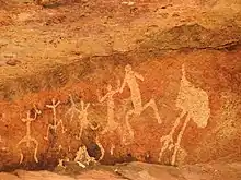 Uluru is considered sacred to the Aboriginal people as it is known to protect ancient spirits of the region.[13] In this sense, Uluru is deeply important to the Aboriginal cultural identity.[13] As the creation of Uluru is central to Adnoartina’s story, this deity is regarded as an important figure in the Aboriginal culture.[4] The blood of Marindi that was described to have dyed Uluru with red ochre is considered to be of spiritual value for Indigenous Australians.[4] In the Aboriginal culture, this ochre is believed to hold spiritual power, particularly through the connection to Aboriginal mythology.[14] As the creation of Uluru is fundamental to the story of Adnoartina, the red ochre from this site is considered to be particularly valued.[14] This ochre is used for ceremonial practices and art to communicate the story of Adnoartina and related beings.[4] For example, red ochre is essential for the 'Mindari' ceremony of the Diyari people, otherwise known as the 'peace ceremony.'[14] Red ochre is used in this ceremony for the purpose of symbolic and decorative ritual as people are painted and given bundles of red ochre to form a spiritual connection to Adnoartina.[14] Other forms of ceremonial practice were the red ochre expeditions which the Diyari people considered to be a spiritual journey.[14] This expedition socially connected the Indigenous people as different tribes would travel to the source of Uluru’s red ochre.[4] It was believed that the red ochre expeditions had the power to connect the Indigenous people to Adnoartina and other related beings.[4] Red ochre was further significant to the Aboriginal community as it was historically used as a currency in trade.[4] The ochre from Adnoartina’s story was valued in this context through the connection to mythology.[14]