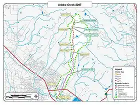 Adobe Creek drains an area of about 10 square miles (26 km2).[1] Its headwaters lie in Lafferty Ranch, a 270-acre (1.1 km2) parcel of land owned by the City of Petaluma since 1995. Lafferty Ranch has been proposed for a wilderness park, but is not accessible to the public.[4] Petaluma Reservoir (which formerly provided water for the city of Petaluma) is located in the Adobe Creek watershed.