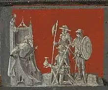 On the pillar there is the Tiburtine Sibyl showing Augustus a vision high above them, a well-known Christian legend.[3] In the versions known to the later Middle Ages the Emperor Augustus asked the sibyl whether he should be worshipped as a god, as the Roman Senate had ordered. She replied by showing him a vision of a young woman with a baby boy, high in the sky, while a voice from the heavens said "This is the virgin who shall conceive the saviour of the world". The episode was regarded as a prefiguration of the Magi's visit, and for example is paired with an Adoration of the Magi on the two side-wings of Rogier van der Weyden's Bladelin Altarpiece (1460), now Gemäldegalerie, Berlin.[15]