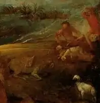 The extensive landscape is of the world landscape type, mostly found in northern paintings at this early date. This was being developed by Joachim Patinir in Antwerp, and if the painting is dated to 1515-1517, Cariani was remarkably quick in using it. Details of the landscape are re-used in later paintings by Cariani, and an interest in German art becomes unmistakable in some later works of his. Here the "angular poses of the figures and the nervous quality of the highlights" may show an early interest. A landscape of lakes and hills is characteristic of Cariani's native Bergamesca region.[4]