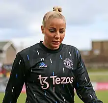 On July 4, 2022, Leon signed a two-year contract with Manchester United.[25] She made her debut for the club on September 17, 2022, as a 64th-minute substitute for Lucía García in the opening game of the season, a 4–0 win at home to Reading and scored her first goal in gameweek three on October 16 in a 4–0 win at home to Brighton & Hove Albion. Leon saw her playing time limited nine appearances in all competitions, including five in the WSL all as a substitute, scoring three goals. She was reportedly the subject of a loan move from A.C. Milan in January and then later offered to several WSL clubs but United stalled and none of these deals could be completed in time. Head coach Marc Skinner confirmed he had been leaving her out of the squad because she needed to improve to earn a spot in a "really competitive squad" and put on extra training sessions for her.[26]