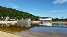 Surf Snowdonia had a freshwater pool which contained a wave-generation mechanism, manufactured by the Leitner Group, and based on a prototype built in San Sebastián, Spain, by Wavegarden.[7] It has a contoured base that could generate three different sized waves, at a rate of one a minute. The pool could generate a 2-metre (6 ft 7 in) high wave which lasted 16 seconds and travelled 150 metres (490 ft).[15] The company claimed this was the longest man-made surf wave in the world.[16] The pool was filled with rainwater collected from Snowdonia reservoirs including Llyn Cowlyd. This water passed through the adjacent hydro-power station, originally built to power the former aluminium plant, before being pumped from the tail-race into the surfing pool.[17]