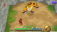 During battles, a weapon limit gauge is shown, filling up over time; by waiting to attack until the gauge is filled up, the player can use a more powerful attack specific to the currently equipped weapon. The gauge resets to zero whenever the player attacks or gets hit by an attack. The player is able to use various different types of weapons, such as swords, axes and flails, each having a different attack pattern: sword attacks, for example, are mid-ranged swings and stabs, while flail attacks are long-ranged and reach out in a straight line from the hero. Most weapons can also be used to affect the environment: the player can cut down trees with axes, for instance. There are also variants of each weapon type with bonus strengths, such as flame variations, which are effective against ice monsters.[7] At various points in the game, the hero is accompanied by non-player characters who help the player defeat enemies.[5][7] These companions have different abilities that the player can use, such as Fuji's healing spell and Watt's shop.[7]