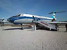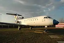 This Yakovlev Yak-40 plane arrived in Hungary in late 1975. It was ordered by LRI and was used to test and authenticate navigation equipment both in Hungary and abroad. It has never flown as a passenger aircraft. In 1987 it was repainted in the same livery as the Tu-134; it was painted in its current livery in 1993. In 2001 it was towed to the aviation museum. The plane is airworthy, in an excellent condition. Its interior can be visited during events.[14]