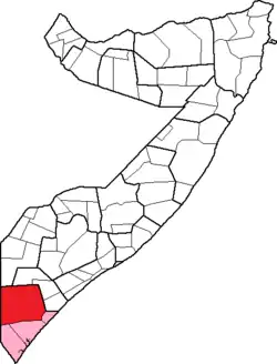 Afmadow is a district in Lower Jubba of Somalia. The district capital is Afmadow.[1] It was first established as a town in 1896. the majority clans in Afmadow is the Marehan clan, who live in every part of the region north of the town and it's south west near the district of Kismayo, followed by the Gaalje'el and Cawramale