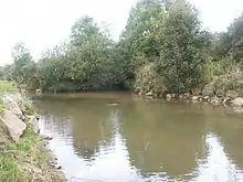 Leaving Rhiwsaeson, about a mile (1.5 km) east of Cross Inn, the Clun widens to between about eight feet (2.4 metres) and 12 feet (3.7 metres) and slows. Here, where the Clun flows to the south of Cross Inn, as well as along the banks of Nant Dowlais and Nant Myddlyn, evidence of otter activity has been noted.[6] The river flows to the south of the A473 Pontypridd to Bridgend (Penybont ar Ogwr) road (Talbot Green By-Pass), where it is fed from the south by Nant Mwyndy. Nant Mwyndy flows over a bedrock of Carboniferous Limestone, rising in Creigiau and, flowing westwards, immediately north of Groesfaen, passing a small industrial estate at Mwyndy, feeding a lake resulting from Victorian opencast iron mining (see History below) and turning south to flow past Cefn-y-Parc Cemetery, Penygawsi, before reaching its confluence with the Afon Clun.[7][8]